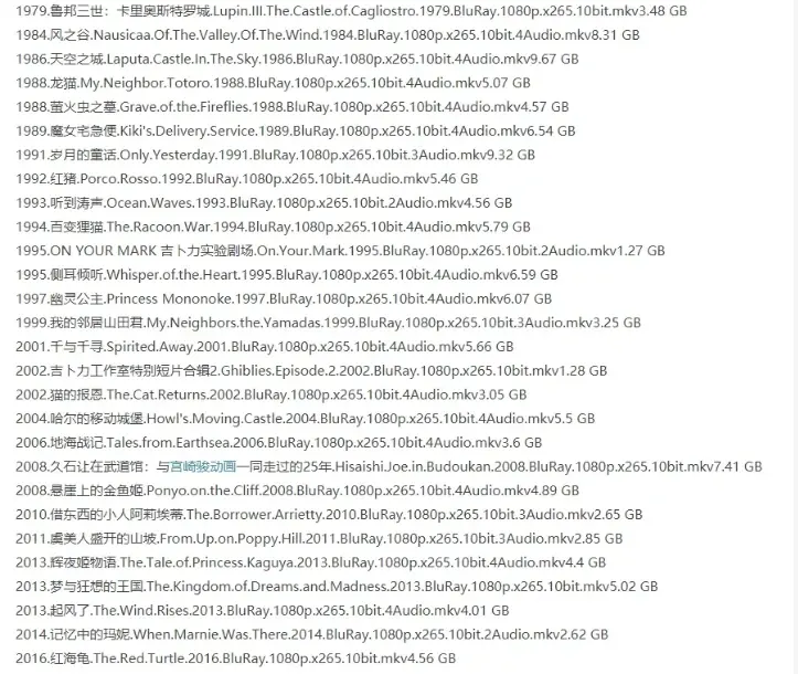 今天给各位小伙伴分享,我珍藏多年的宫崎骏作品全集,一共28部,136G珍藏版作品范围涵盖1979-2016吉卜力工作室,全套高清BD.1080P.x265.10bit。